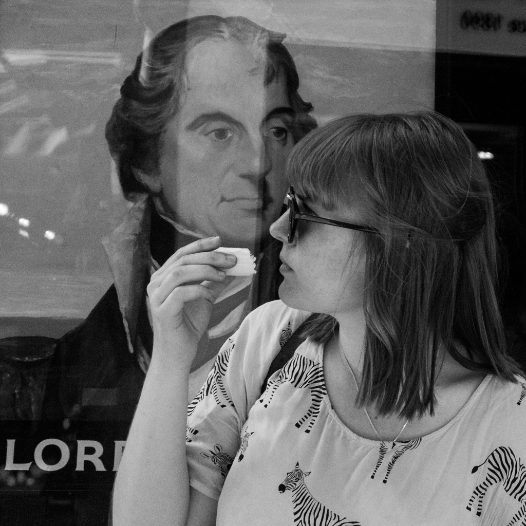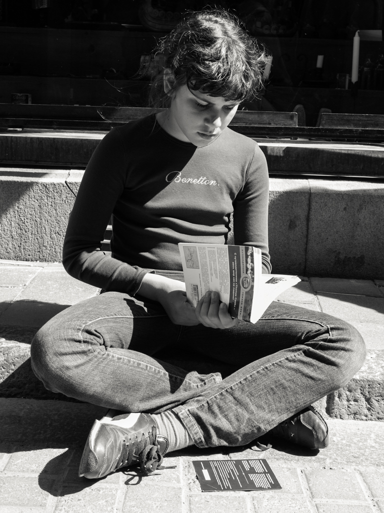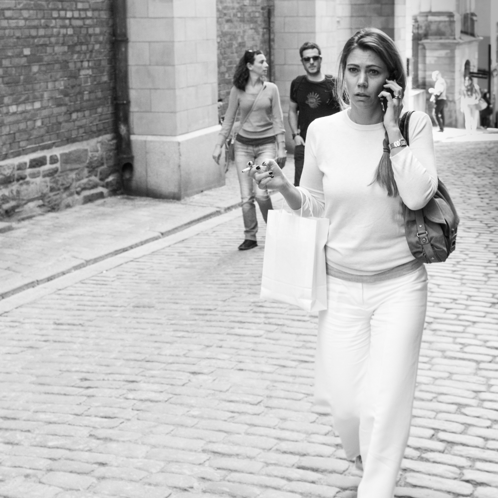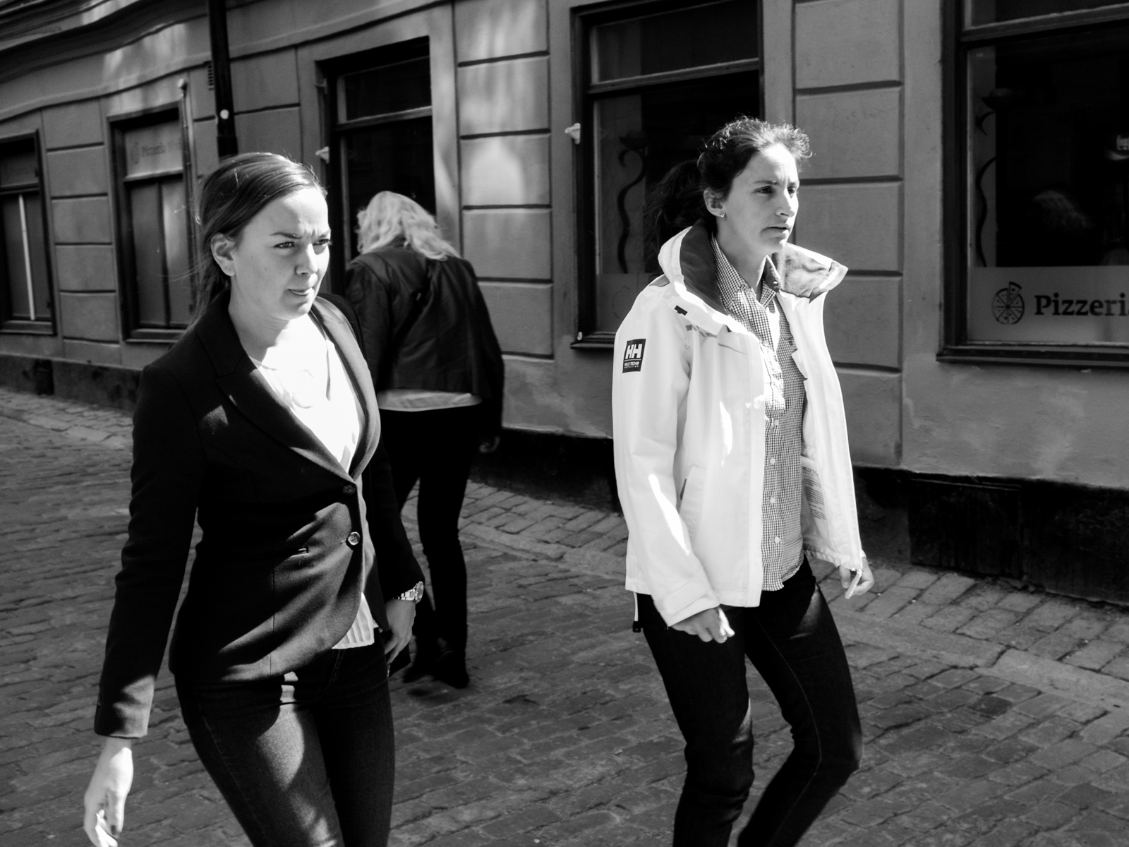 This photograph was also made in the old town of Stockholm. I saw them (a family?) coming down the street and that the girl (on the boys back in the window reflection) had some trouble going down the stony road. I sat down on the other site of the road and just waited for the rest of the subjects to come into the frame. When the boy with the girl on his back was reflected in the window and the rest of the family was in position I just had to press the shutter. It is not often one has this amount of time, I would say it's very rare, so rare that it almost becomes frustrating because it starts to get difficult to decide when to press the shutter because you have options. Most of the time you only have fractions of a second and after that the shot is gone, even if you have found your situation unfold for several seconds and you have figured out how to approach the situation. So if I divide my street shots into fractions of time, finding and figuring out the the situation makes up more than 90% of the time (in many cases 95-99%). The framing, focusing and finally pressing the shutter is just something that is done in a quick sequence of motion, when I lift the camera and put the viewfinder to my eye, the photograph is practically already made. This is something that I want to change and I will practice hard this year, to actually allow me to slow down and take more time for the final steps (framing, focusing and pressing the shutter).
